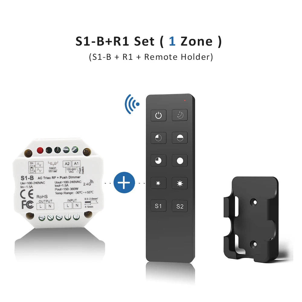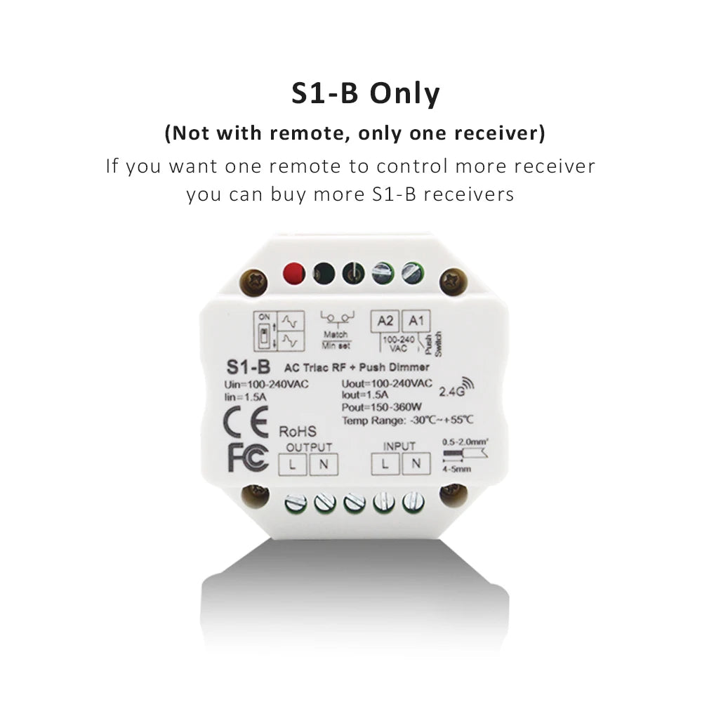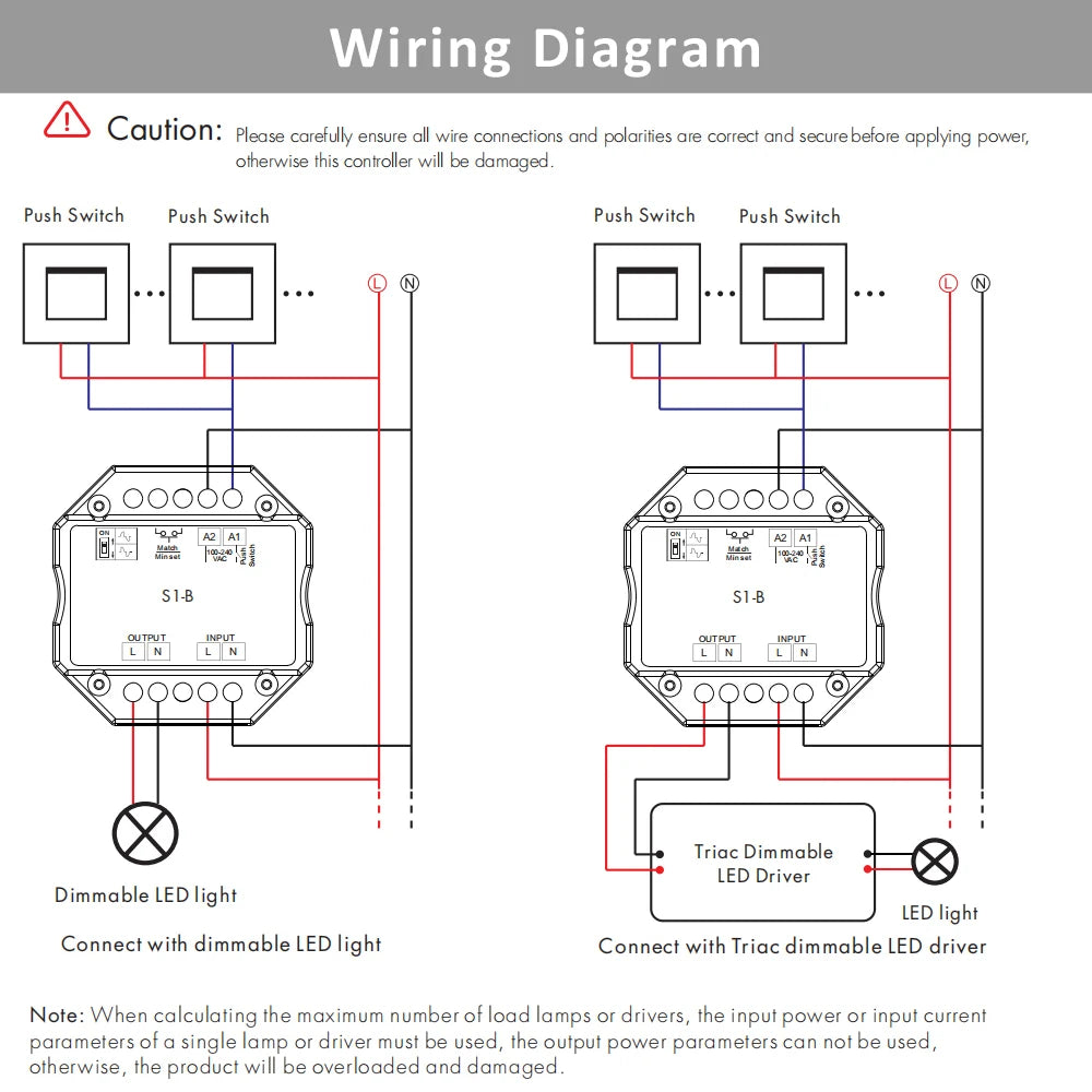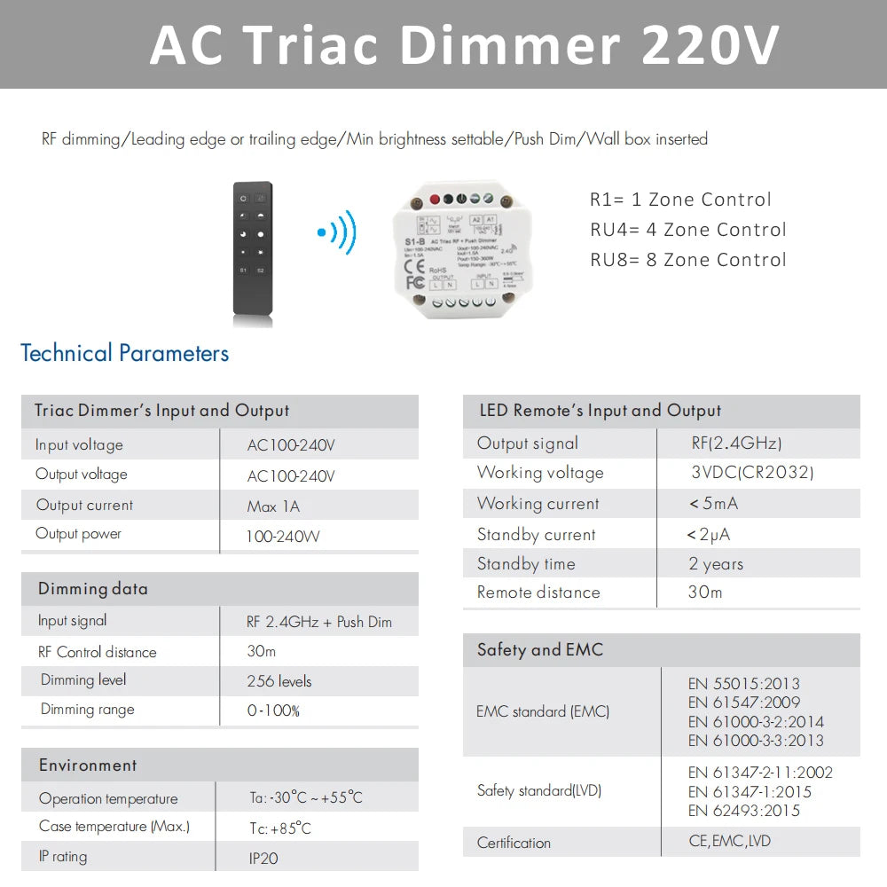 RF dimming/Leading edge or trailing edge/Min brightness settable/Push Dim/Wall junction box mounting