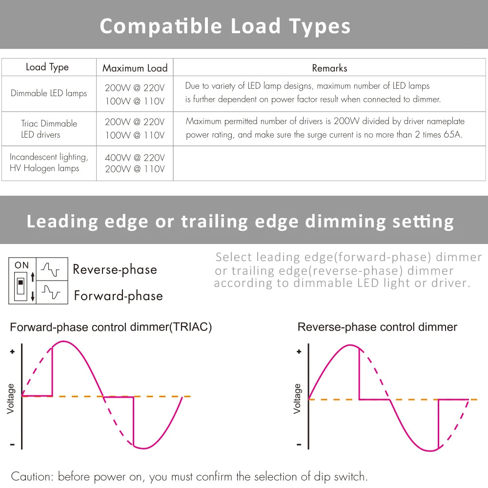 Select leading edge(forward-phase) dimmer or trailing edge(reverse-phase) dimmer
