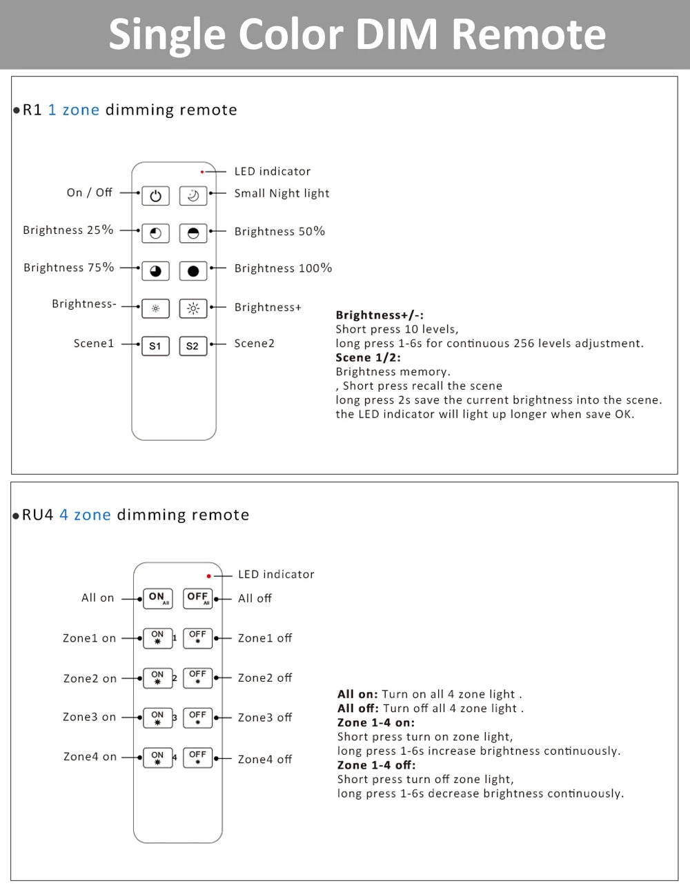 ● Compatibility with RF 2.4G single zone or multiple zone dimming remote control.