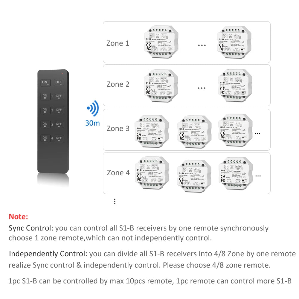 ● Auto-synchronization: Multiple receivers within 30m distance can work synchronously when they are controlled by the same remote.