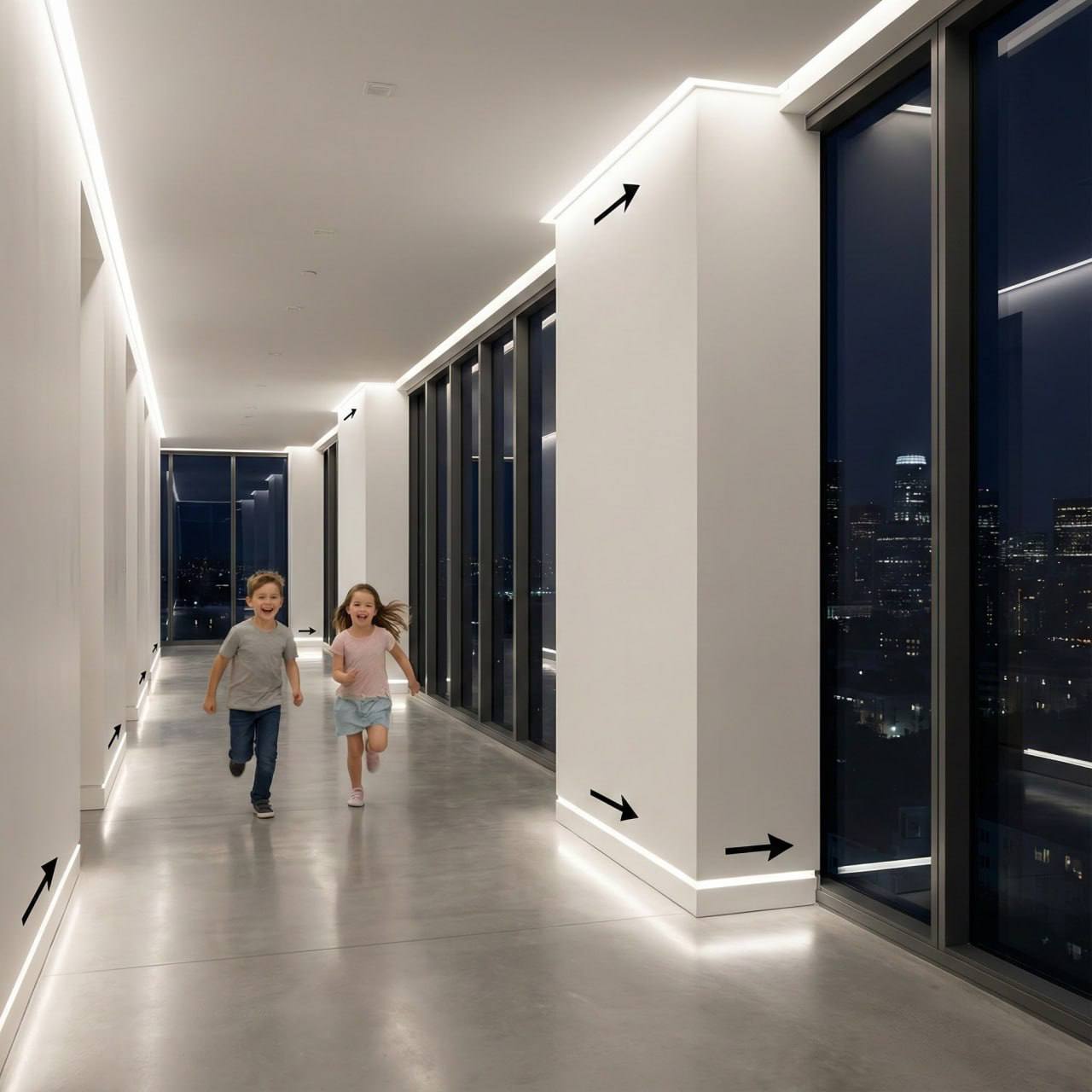 Soft, stylish, with the effect of running water. Install motion sensors on both sides of the hallway, kitchen, living room, at the beginning and end of the stairs, at the entrance and exit — the lighting will react to movement from any side.