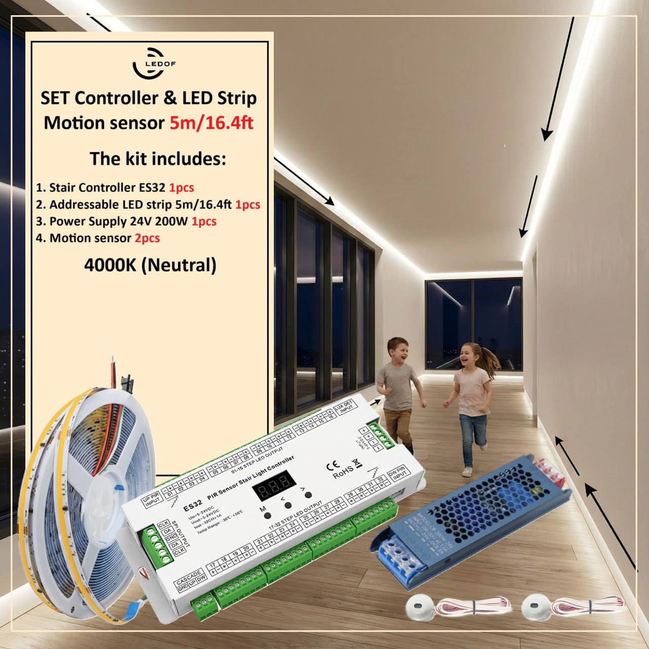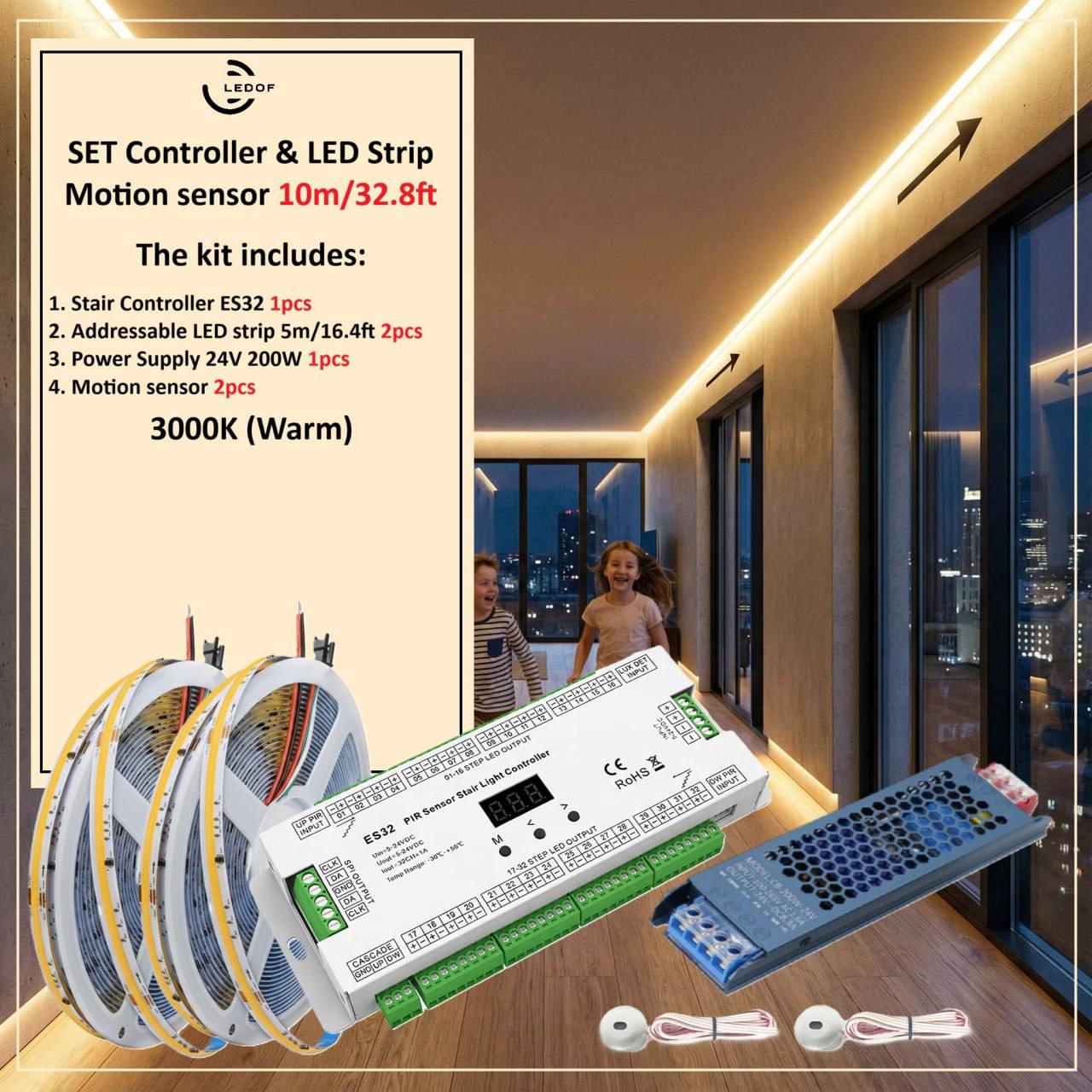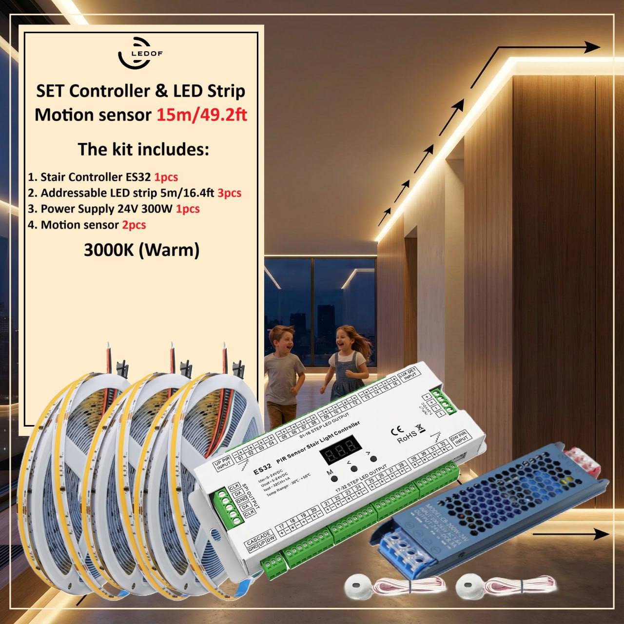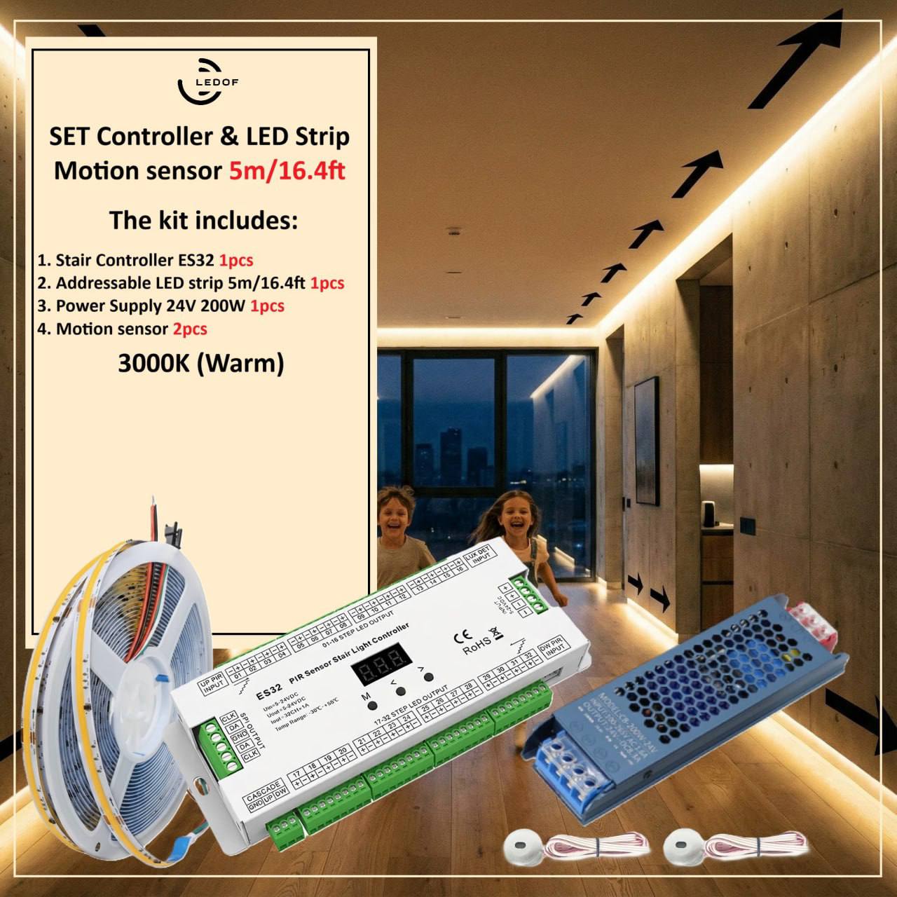 The LED lighting kit with two motion sensors turns on automatically when you are near.