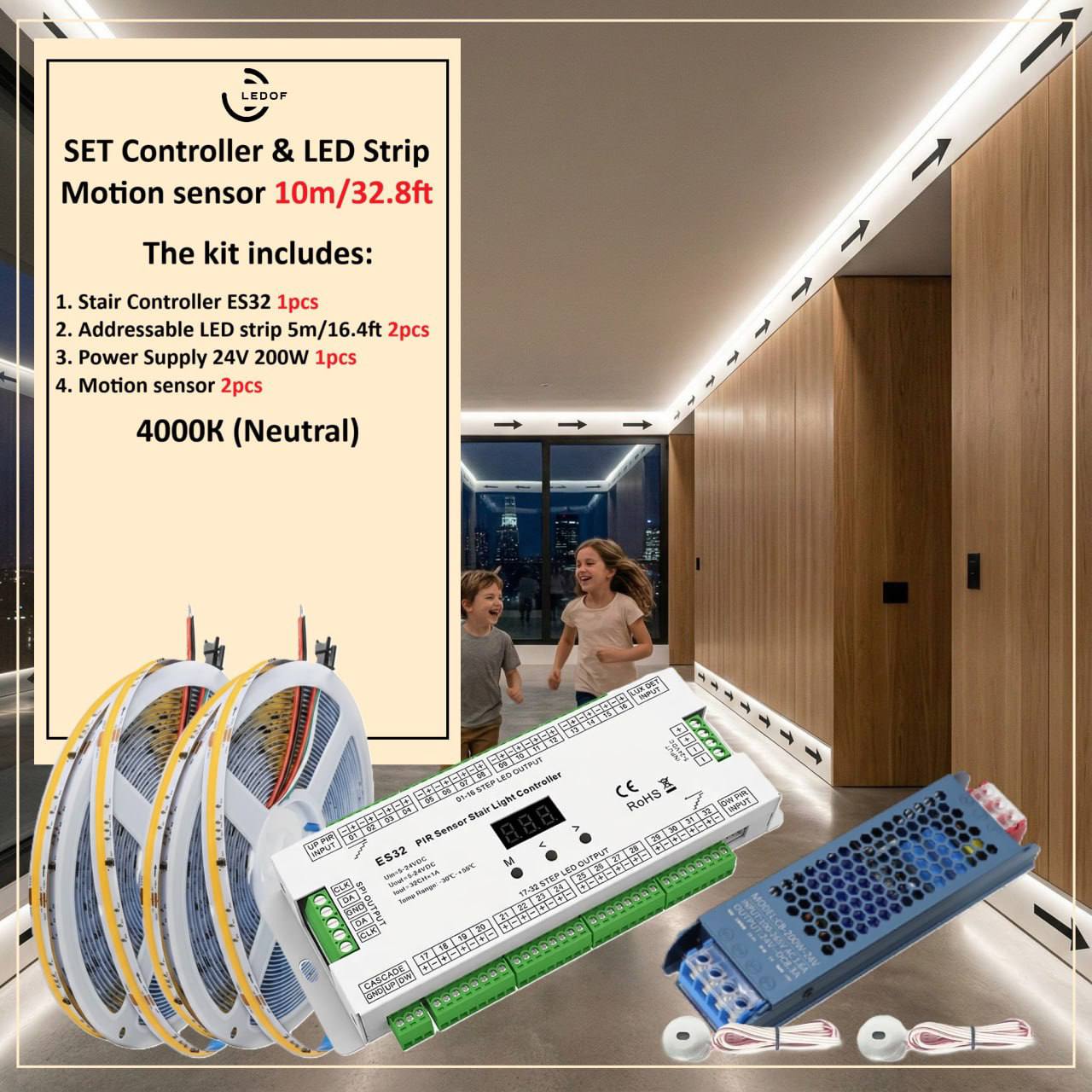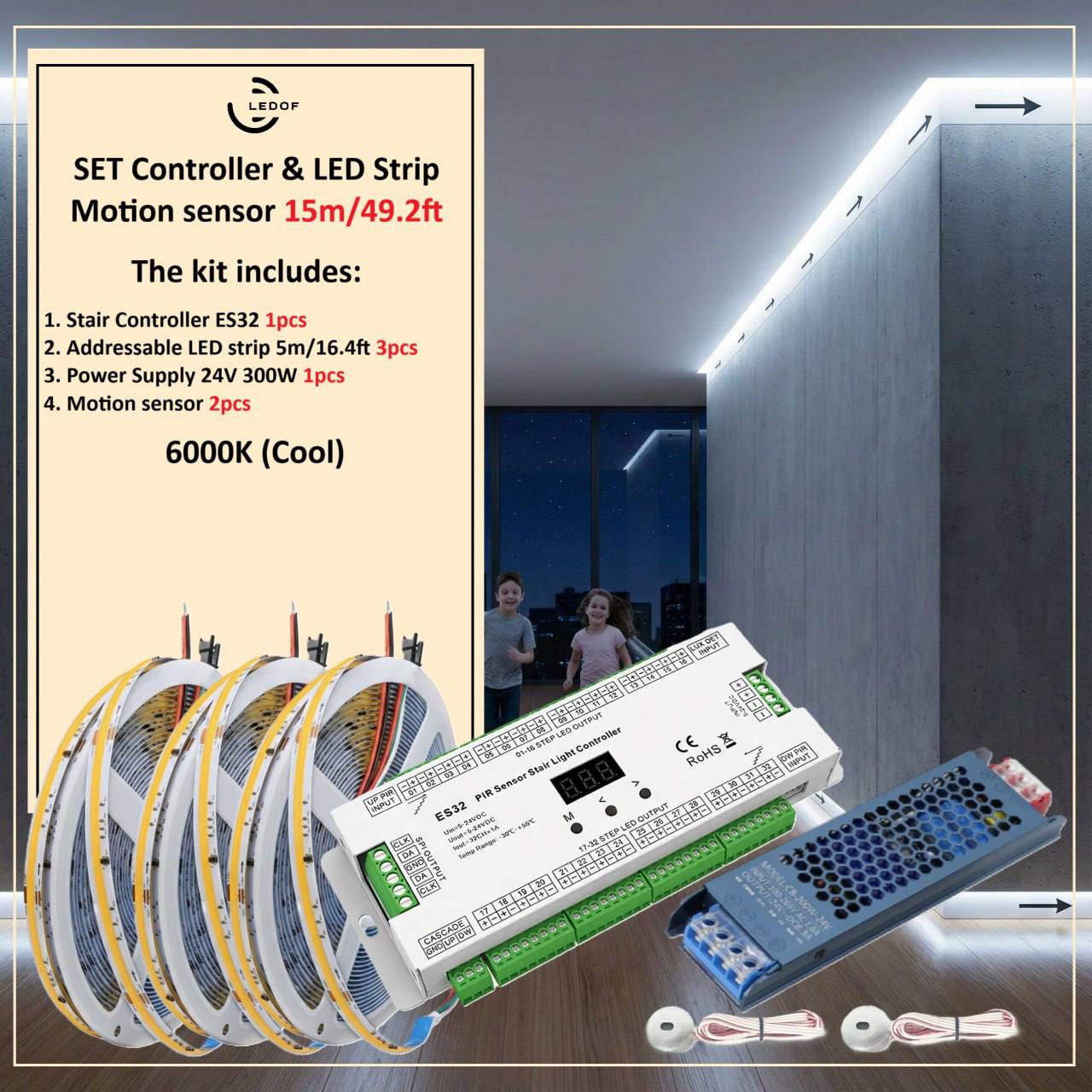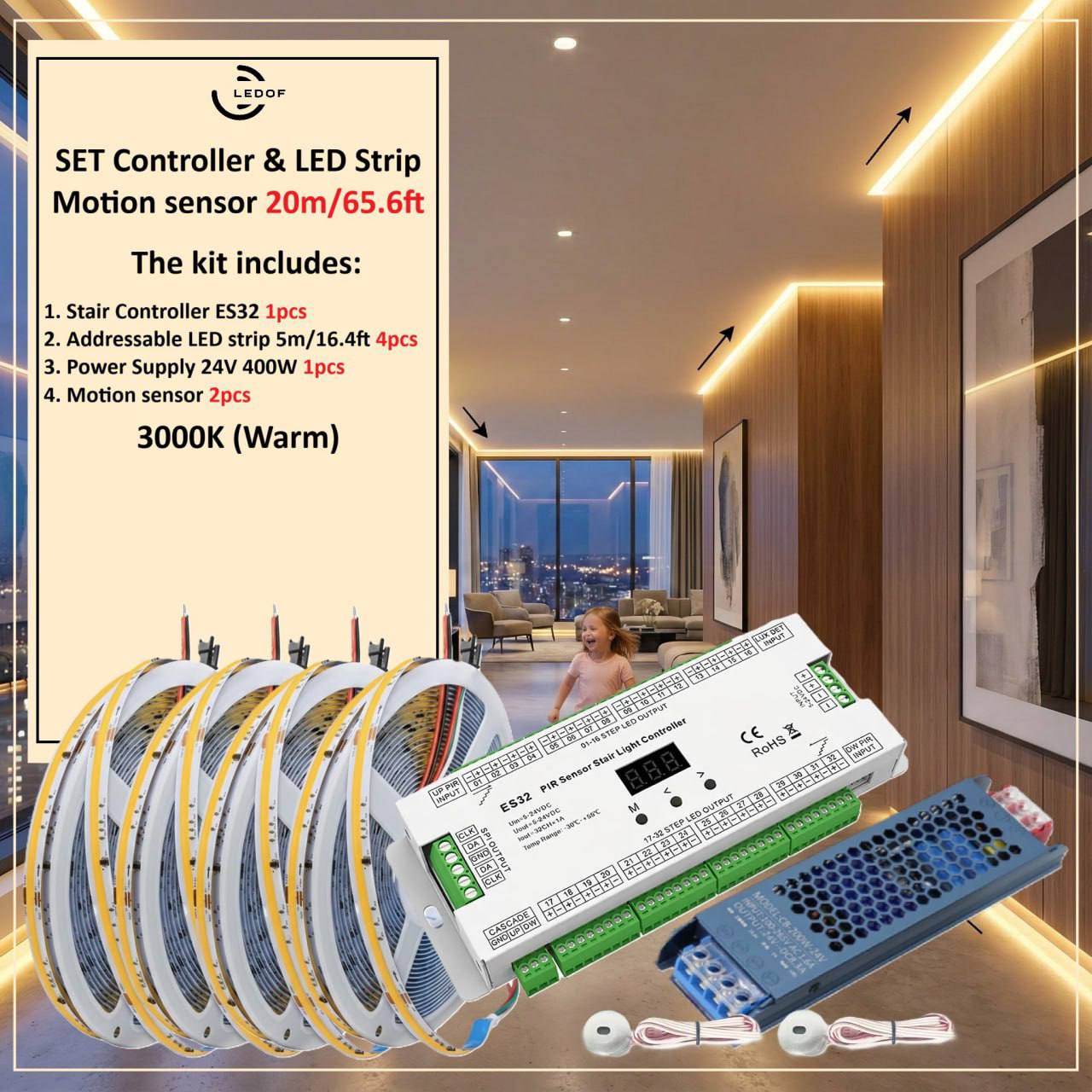 The LED lighting kit with two motion sensors turns on automatically when you are near.