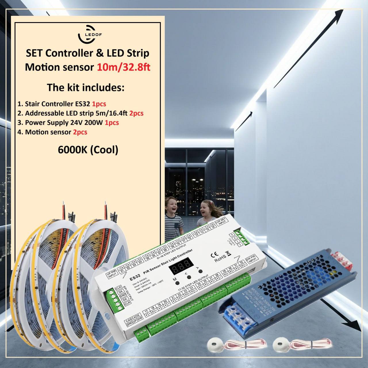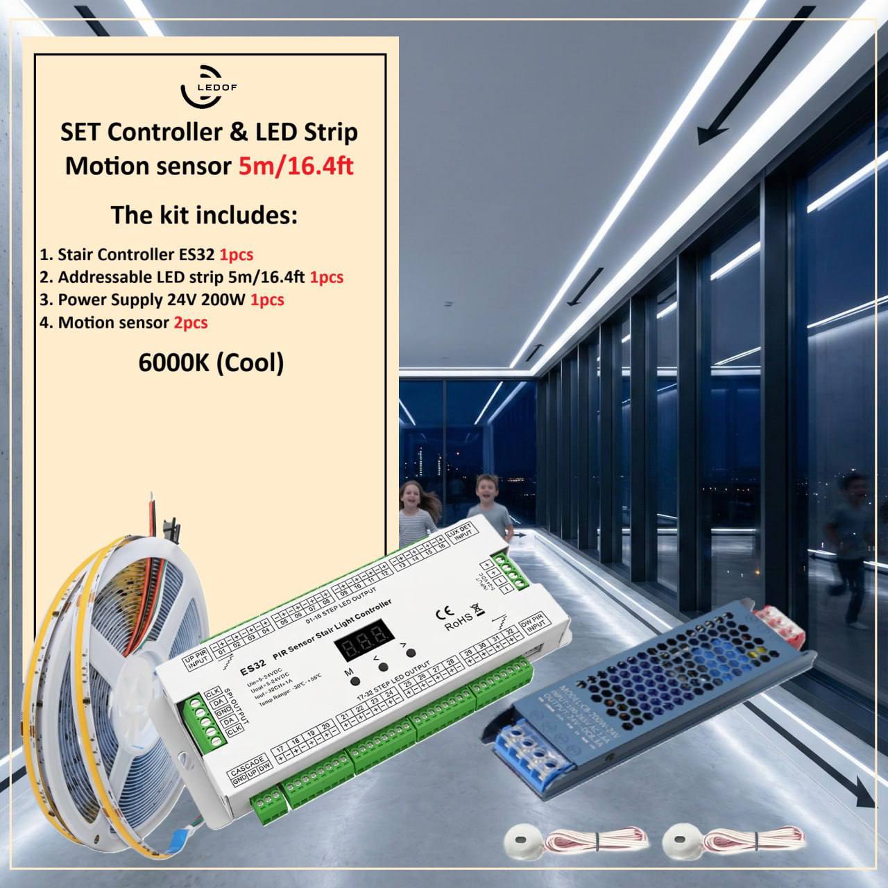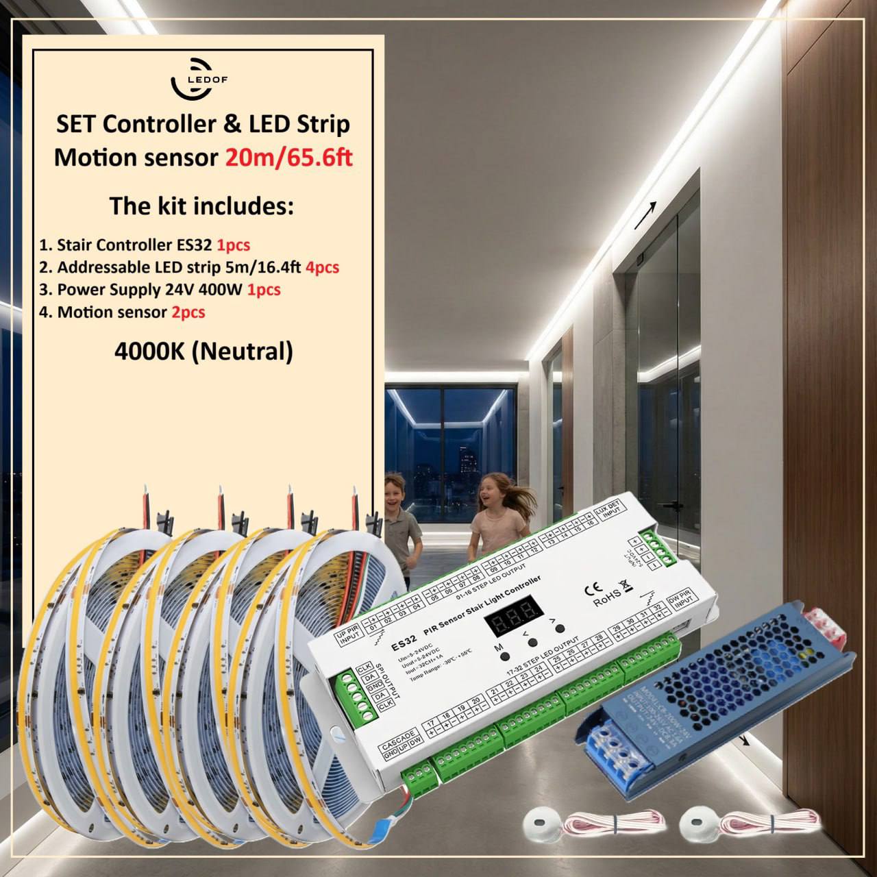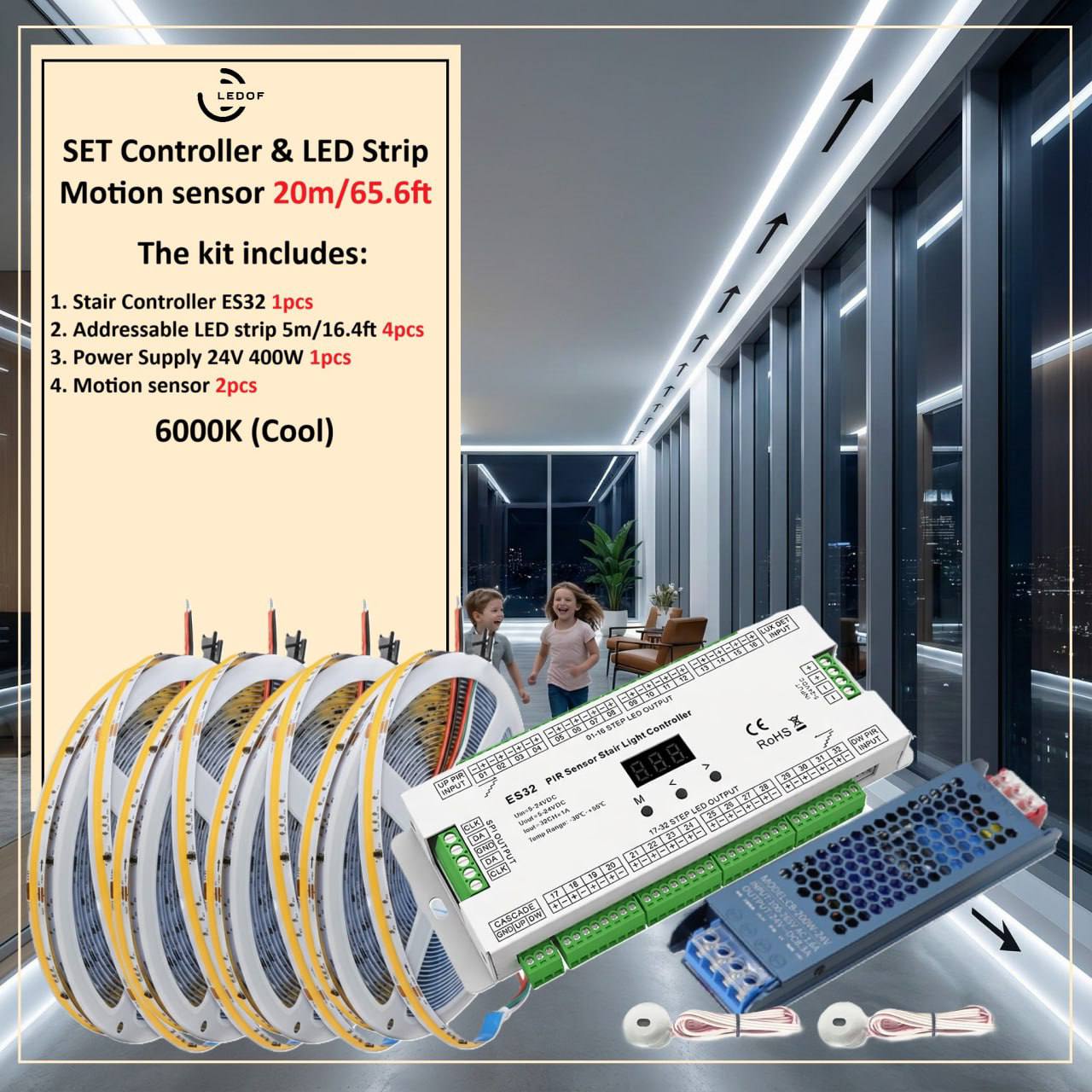 The LED lighting kit with two motion sensors turns on automatically when you are near.
